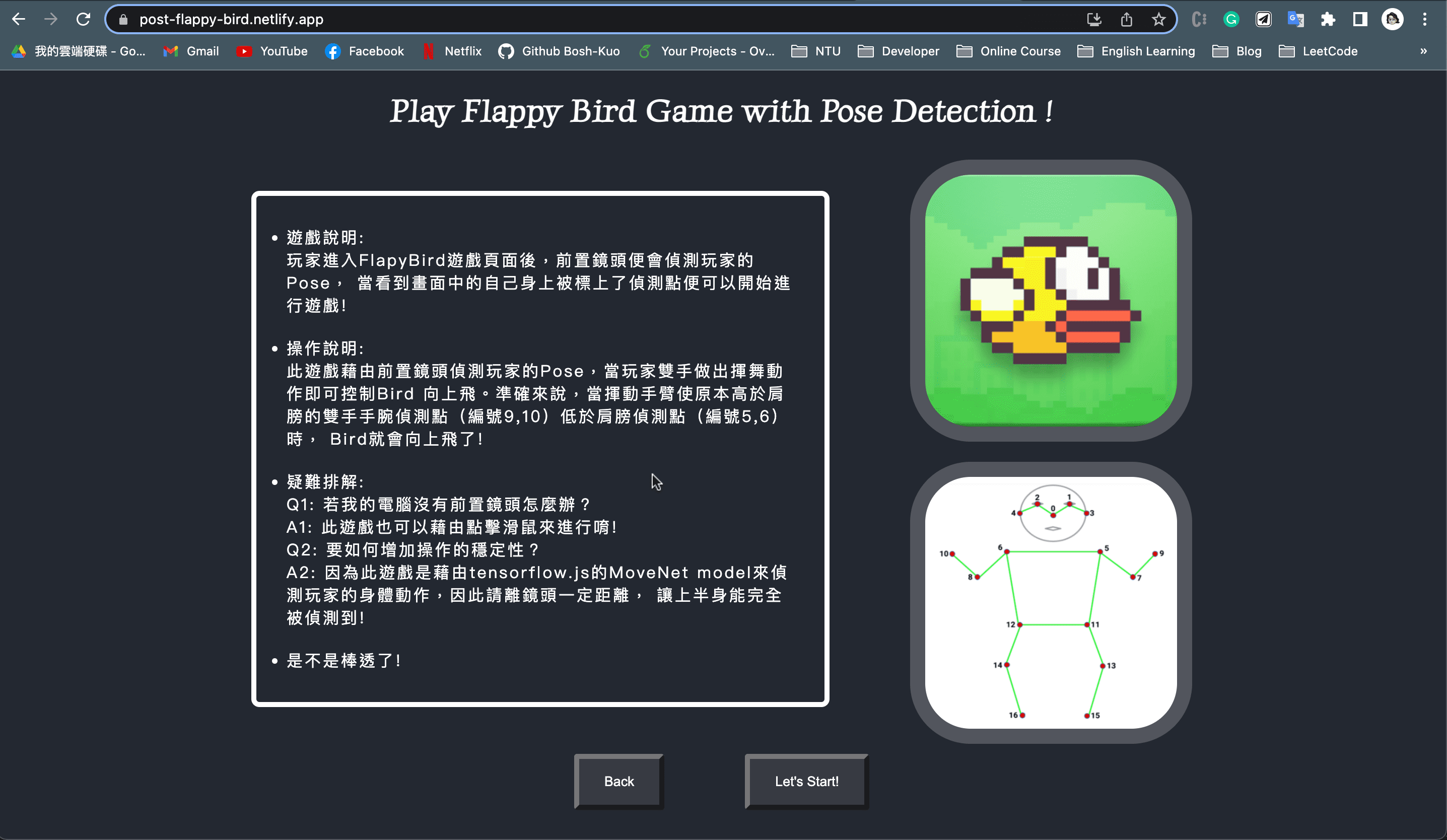 Web WorksBosh's Tech NotesIt's Bosh's tech notes website. It records the issues I encountered and the knowledge I learned when developing.Computer Vision Game PlaygroundIt's a computer vision web-based gaming program that incorporates webcam and computer vision technology.Pose Flappy BirdThis is an interactive web-based game based on computer vision technology, inspired by the classic Flappy Bird game.E-CommerceThe project is a full-stack website for an e-commerce platform.Mine SweeperA simple pure front-end mine-sweeper game.AI WorksGNN-LSTM-based Fusion Model for Structural Dynamic Responses PredictionA novel GNN-LSTM-based fusion model which could accurately predict the seismic responses of multiple structures with different geometry.Topic Transition Through DialogueA salesman chatbot to transit the dialogue from open-domain to task-related topic.